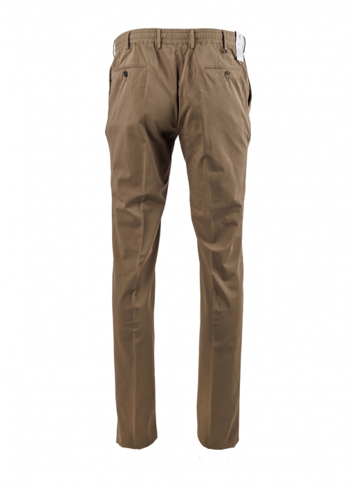 Брюки из хлопка. Стандартный крой, застежка на пуговицу и молнию, частично эластичный пряс с кулиской во внутренней части, боковые французские карманы, задние прорезные карманы на пуговицах