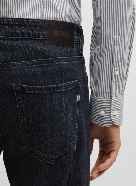 Джинсы зауженного кроя. Стандартная посадка, застежка на пуговицу и молнию, пять карманов, металлическая монограмма на заднем кармане