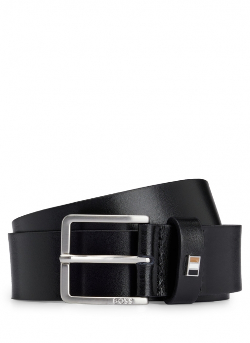 Ремень с фирменной полоской на дужке. Выгравированный логотип на застежке, фурнитура из матового серебра